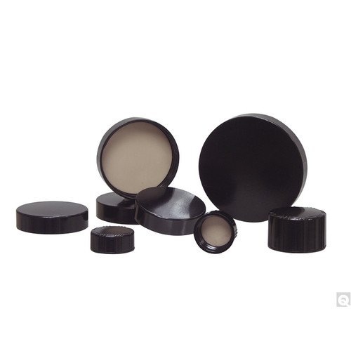 70-400 Black Phenolic Cap with F217 & PTFE Liner. Black Phenolic F217 & PTFE Lined Caps are known for providing the widest range of chemical compatibility and for being the most temperature tolerant of plastic closures. Foam backed PTFE liners resist attack from virtually all chemicals at room temperature and provides resilience for a tight seal with a low moisture transmission rate. F217 has a low density foam core between two solid layers of LDPE. Uses include analytical lab samples, high purity chemicals, strong acids solvents, environmental samples, pharmaceuticals, and diagnostic reagents.