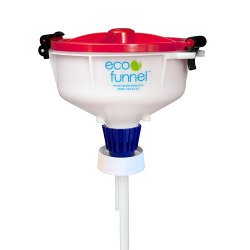 ECO Funnel® is a safety funnel that features a long tube to prevent evaporation, a short airlock tube, and a gasket to help keep fumes safely contained. The larger 8″ ECO Funnel includes an additional safety feature to prevent over-filling that the 4″ version does not have; the secondary air-lock tube creates a small air gap in your waste container, which causes fluid to back up temporarily into the funnel when the container is full. After the screw cap adapter is loosened, the remaining fluid will safely flow into the container and not spill. Protect your lungs, prevent lab fires, and keep chemicals out of the water supply!