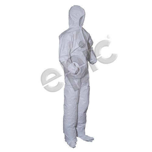 Designed for full-body protection, this coverall features an attached hood, attached boots, and a zipper front entry with a storm flap to create a secure seal. The serged seam construction, along with elastic wrists and an elastic lower back, ensures a comfortable fit while maintaining a high level of barrier protection.