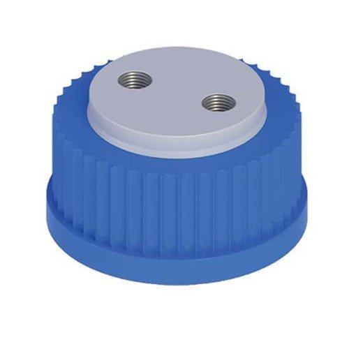 GL45 Port Cap Kit, reinforced Stainless Steel 1/4-28 UNF threads, PTFE inner, blue spin collar, designed for use with 45mm media bottles. Fits glass bottles with a GL45 (45 mm) neck size. 304 Stainless steel (SS) threaded insert minimizes cross-threading on soft PTFE ports and is ideal when tubing adapters are regularly removed and re-attached. Create a closed system using port caps to prevent hazardous vapor evaporation in the lab. These port caps accept standard 1/4″-28 UNF fittings to easily connect semi-rigid tubing. Choose tubing adapters based on your tubing size. A set of plugs in included to maintain a closed system when holes are not in use. Note: we suggest you order an optional vent filter to allow for pressure changes and safe off-gassing (not included) when a port cap does not have a built-in vent. Kit includes plugs for each hole Autoclavable Threaded holes are angled at 10° for easy access Use with 1/4-28 UNF adapters based on your tubing size. 1/8″ or 1/16″ OD tubing (not included) can be used with matching adapters in a solvent delivery system (tubing goes all the way in the bottle) Tubing larger than 1/8″ can be used with barb fittings as part of a solvent waste reservoir (tubing ends at the cap) Prevents evaporation of volatile compounds Polypropylene outer collar (non-wetted) with a PTFE inner Anti-twist free-spin collar rotates independently to prevent tangling lines Please note: it is not possible to ground glass and plastic (non-Justrite®) containers; this may result in a safety hazard with flammable solvents. WARNING: This product can expose you to chemicals including Tetrafluoroethylene, which are known to the State of California to cause cancer. Prop 65 Warning