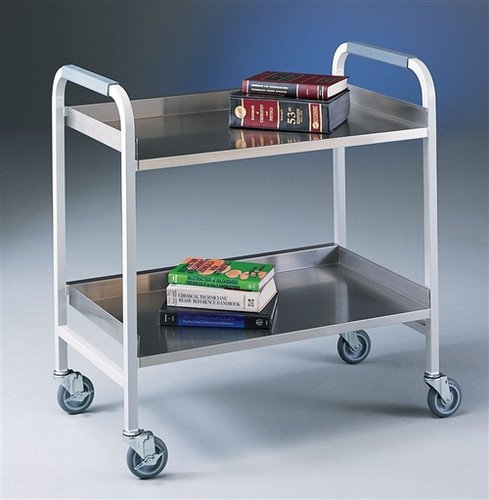 Stainless Steel Cart, holds a variety of laboratory supplies, equipment and miscellaneous containers. Features two removable polished Type 304 stainless steel pans that are 2″ (51 mm) deep on three sides with one open side for easy equipment transfer from countertop to cart. Additional features: 4″ Diameter casters, two with toe locks; ready-to-roll, full factory assembly; ergonomic, extruded rubber handle grips; durable glacier white, epoxy-coated 18 gauge welded tubular steel frame;IDtag; supports loads up to 400 lbs.; lifetime guarantee. 4 week lead time. Ships from either Kansas or Missouri.