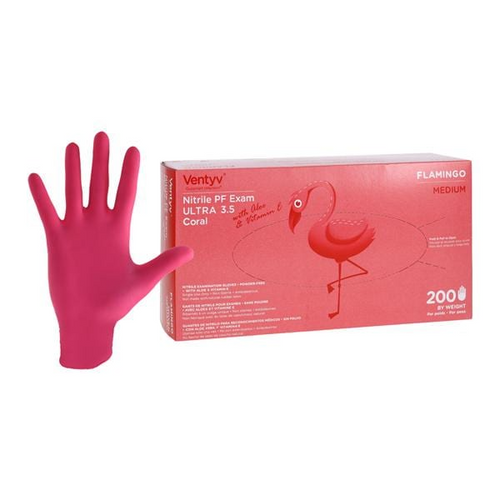 Ventyv® Disposable Medical Examination Glove Ultra 3.5 (Flamingo), Nitrile, Powder-Free (PF), Polymer Coated, Aloe & Vitamin E, Textured, Beaded Cuff, Coral pink, packaged 200 per box, 10 boxes per case (Continental US Only). This high end glove is a must-have for its Aloe and Vitamin E coating, which provides protection against dry and cracking skin.